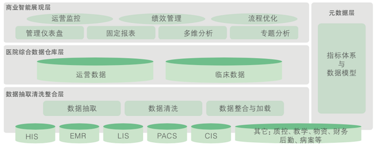 1)基于醫(yī)院戰(zhàn)略發(fā)展的需要,醫(yī)院信息化經(jīng)過這些年的建設(shè)信息系統(tǒng)面臨轉(zhuǎn)型,即從面向應(yīng)用到面向分析的轉(zhuǎn)型,同時能夠提升信息系統(tǒng)價值,使信息化向數(shù)據(jù)分析、決策支持領(lǐng)域邁進(jìn)。