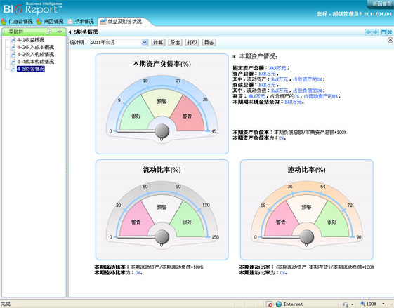 對(duì)于平均住院日及病床使用率等關(guān)鍵指標(biāo),我們通過(guò)儀表盤(pán)的方式進(jìn)行展現(xiàn),通過(guò)與目標(biāo)值的比較得出關(guān)鍵指標(biāo)是否達(dá)標(biāo),并通過(guò)儀表盤(pán)上指針的指向能夠快速獲得關(guān)鍵指標(biāo)的達(dá)標(biāo)信息。
