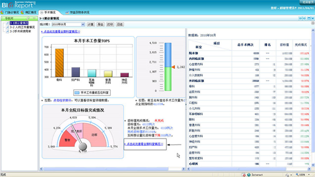 對(duì)于手工工作量我們通過(guò)按照科室進(jìn)行排名,并將全院手術(shù)目標(biāo)完成情況通過(guò)儀表盤(pán)的方式進(jìn)行展現(xiàn),通過(guò)指針指向能夠快速了解手術(shù)指標(biāo)完成情況。