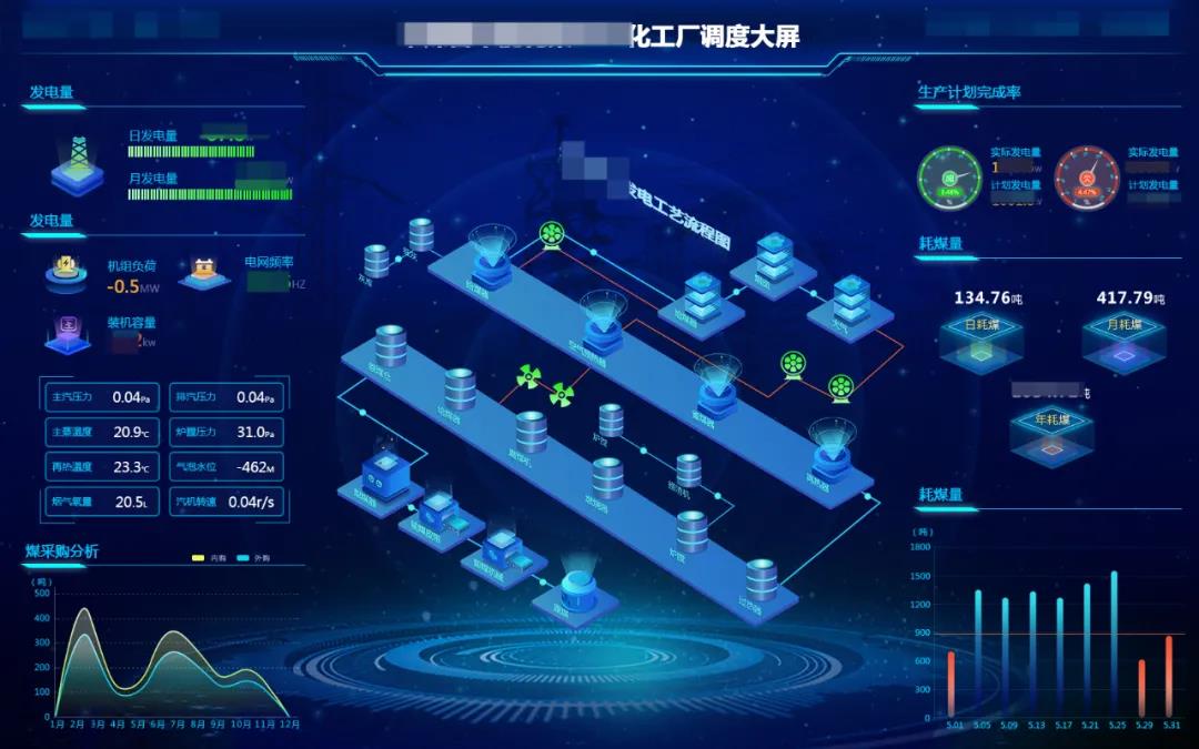某世界500強的能源化工集團以期將智能化的數據監控技術與安全生產相融合,開啟了大屏的數據可視化項目。將現實業務場景中的生產流程圖、工藝流程圖搬到了大屏之上,實現點、面集中、統一管理,有助于管控、防治安全隱患的發生,避免不必要的經濟損失。另外,通過對產能、經濟效益的監控,及時有效的發現問題,最大限度的簡化解決問題的路徑,提高各級管理能力以及生產運行效率。